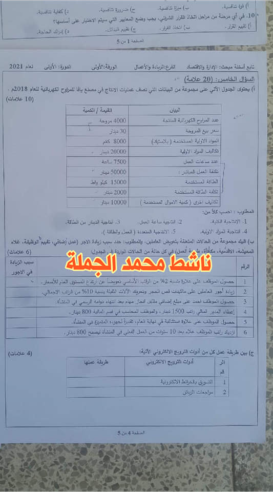 امتحان الإدارة والاقتصاد (الورقة الأولى) الدورة الأولى توجيهي 2021
