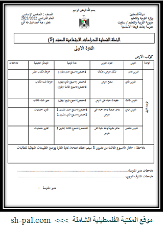 خطة الدراسات الاجتماعية للصف الخامس (جميع الفترات) 2021 - 2022