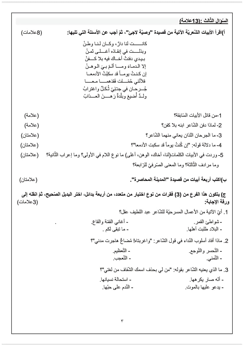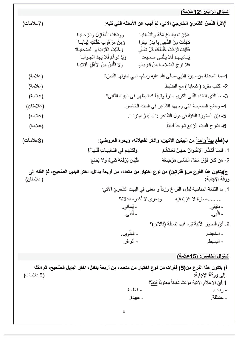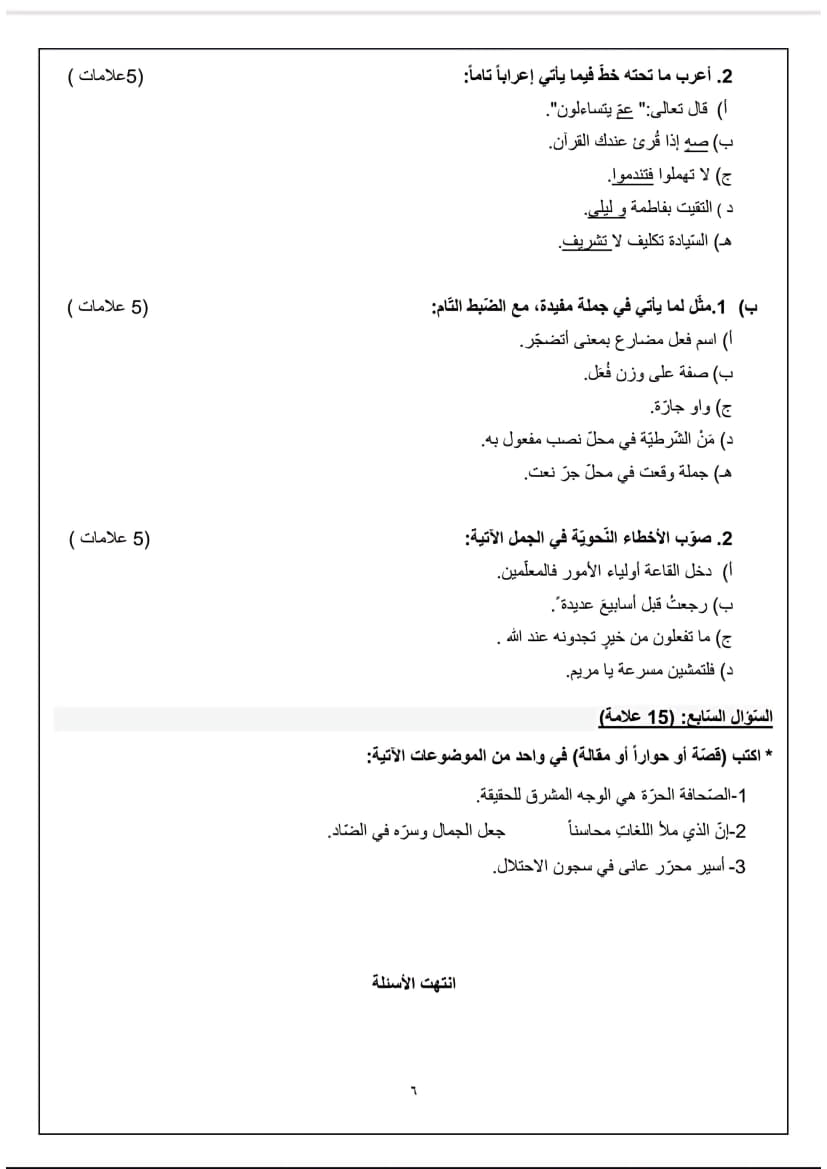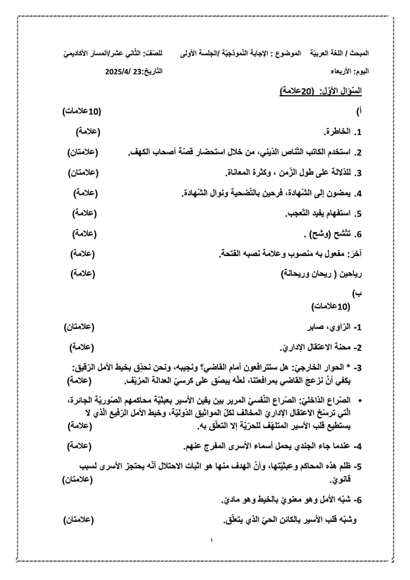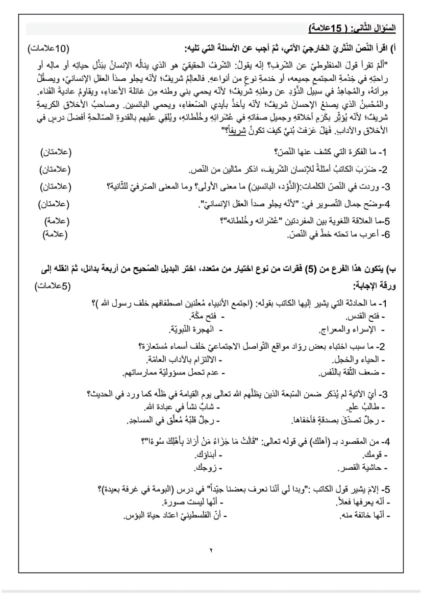 امتحان تجريبي اللغة العربية الورقة الأولى توجيهي 2025 (جنوب الخليل)