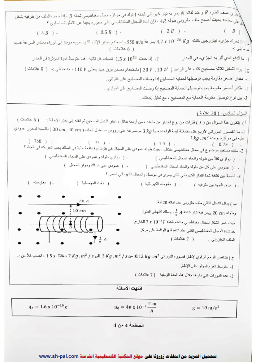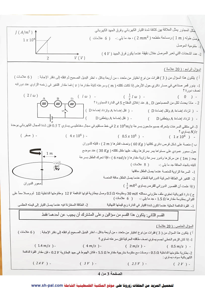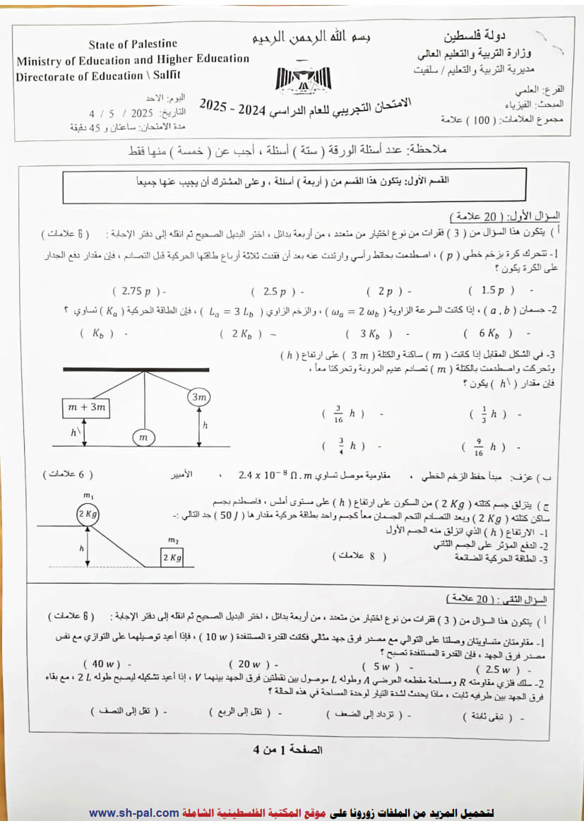 امتحان تجريبي فيزياء توجيهي 2025 (سلفيت)