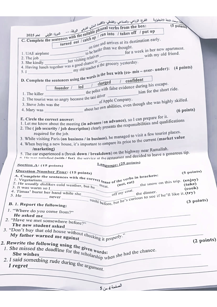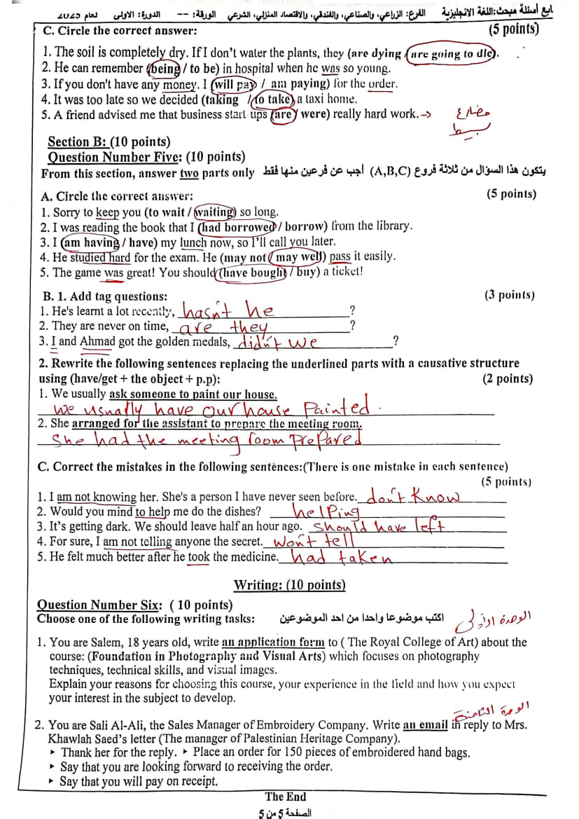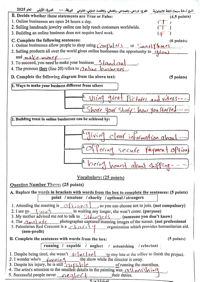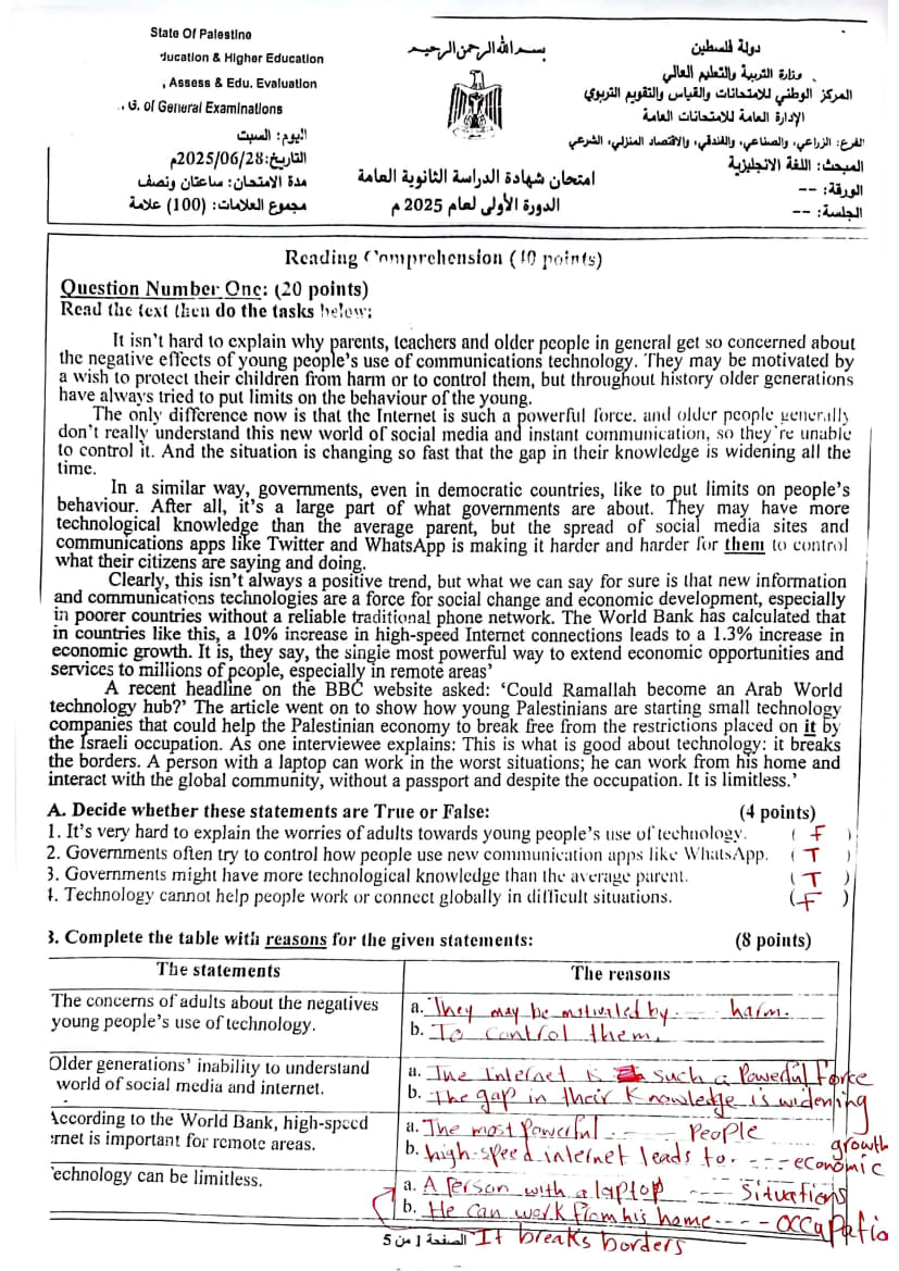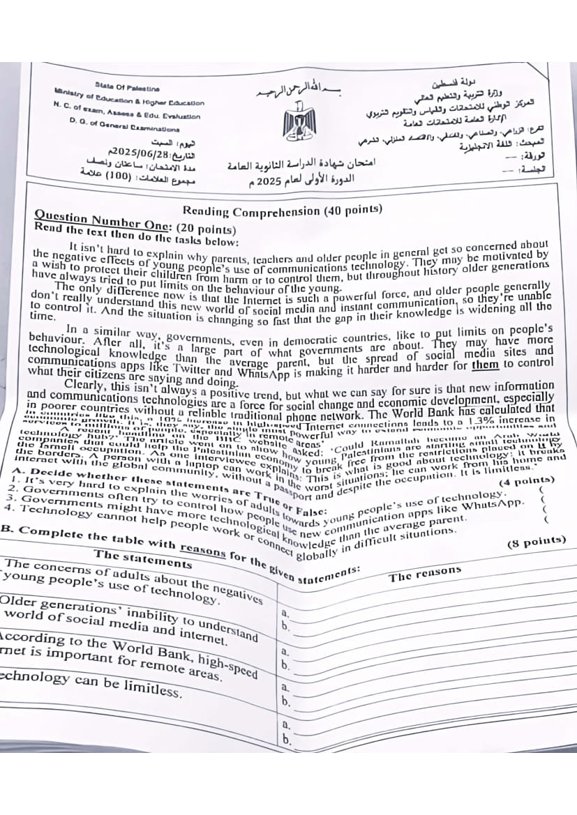 امتحان اللغة الانجليزية الثانوية العامة (توجيهي صناعي زراعي فندقي شرعي) الدورة الأولى 2025