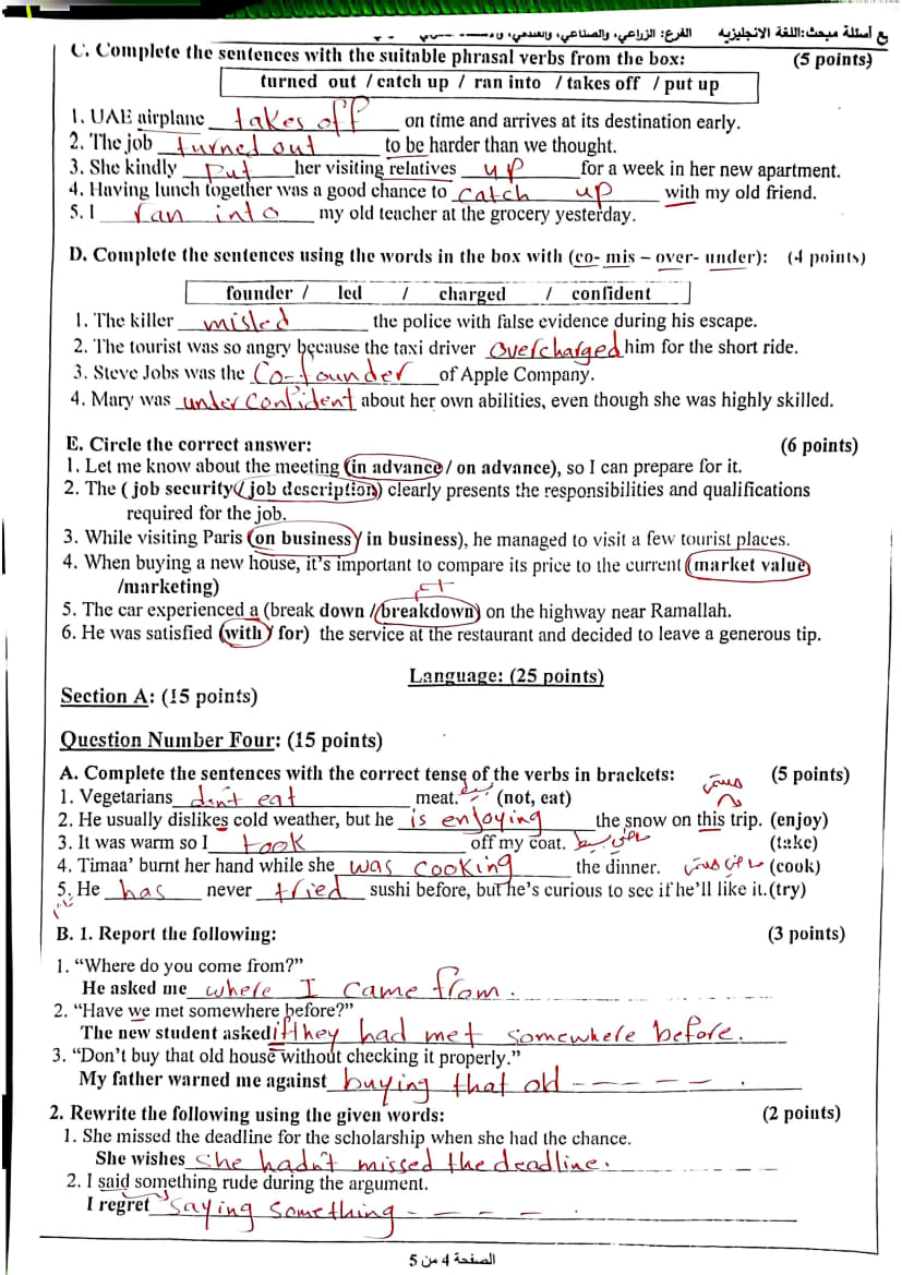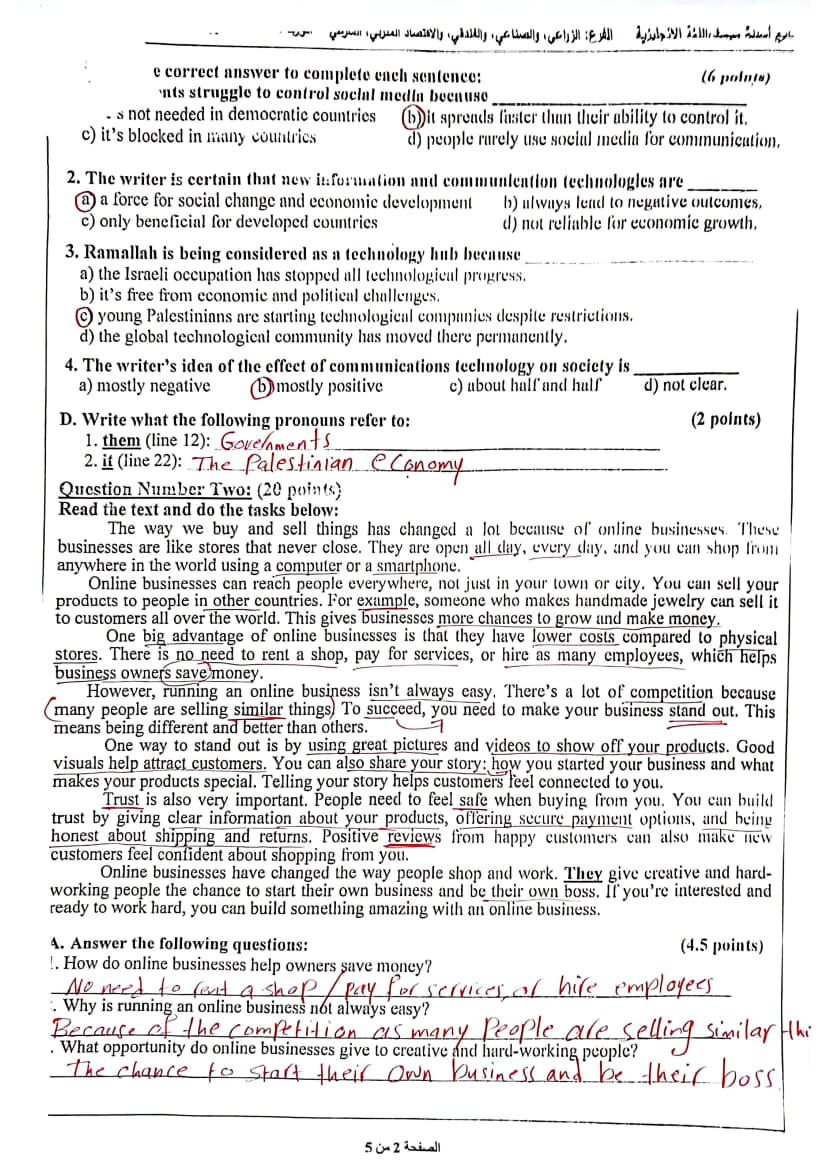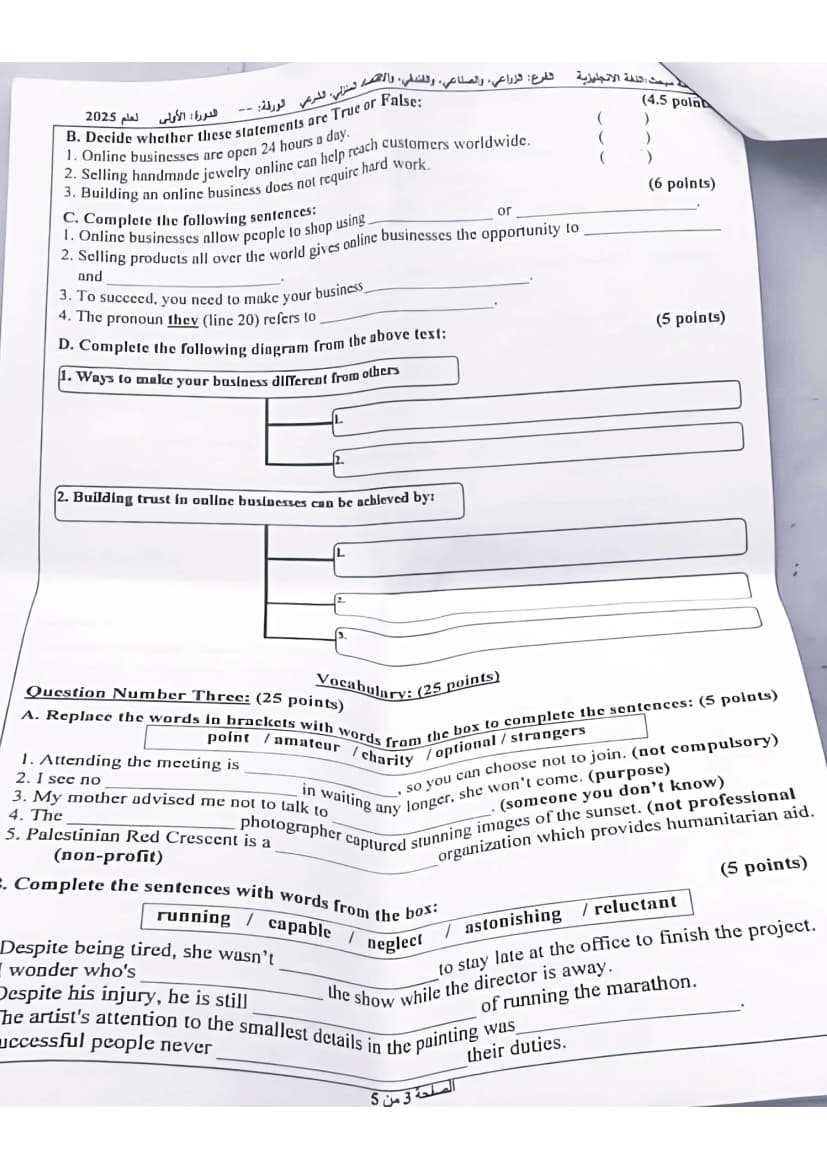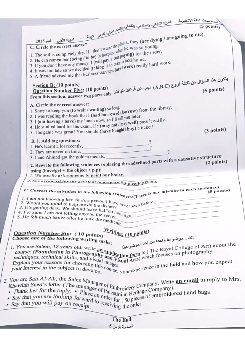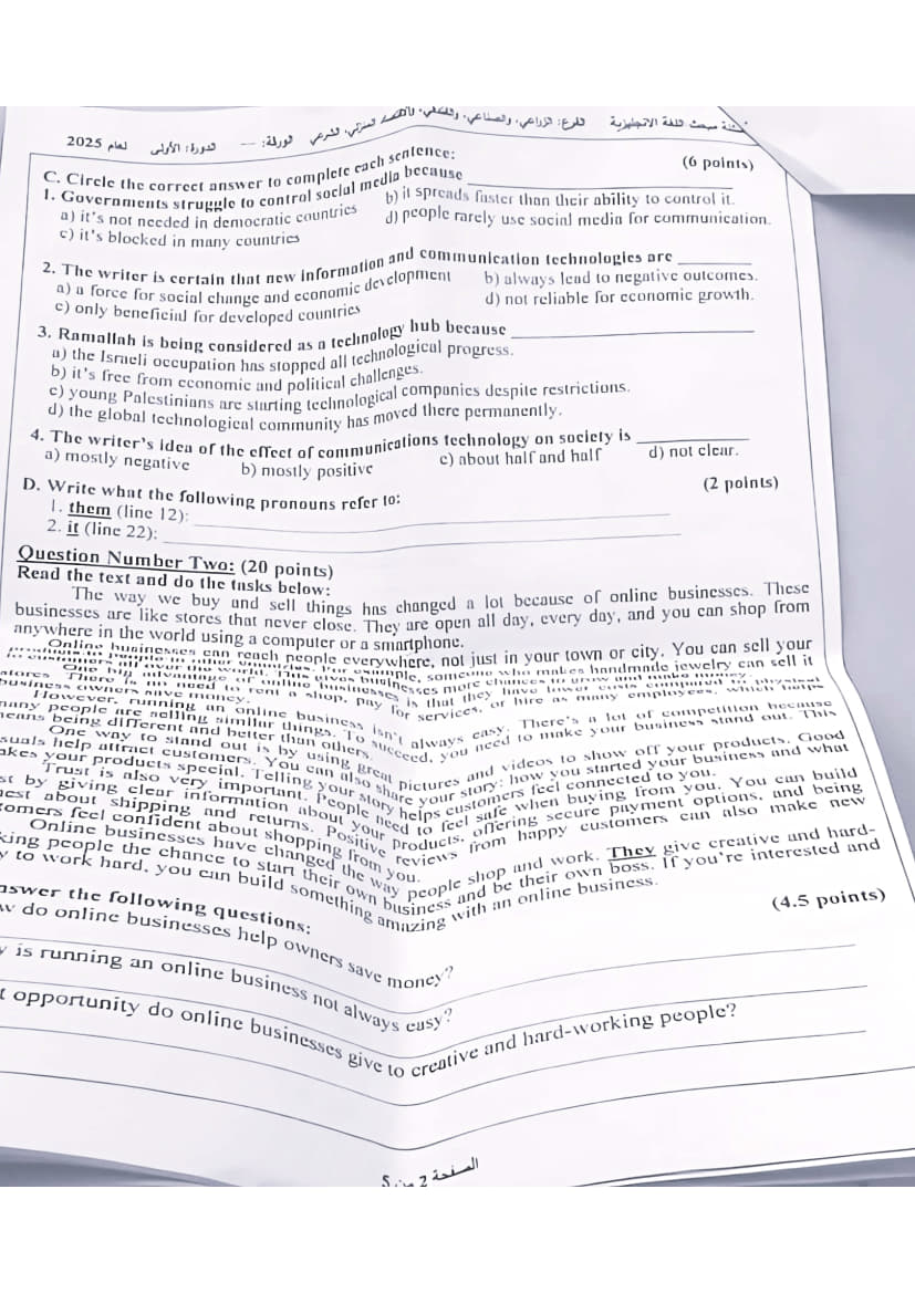 امتحان اللغة الانجليزية الثانوية العامة (توجيهي صناعي زراعي فندقي شرعي) الدورة الأولى 2025