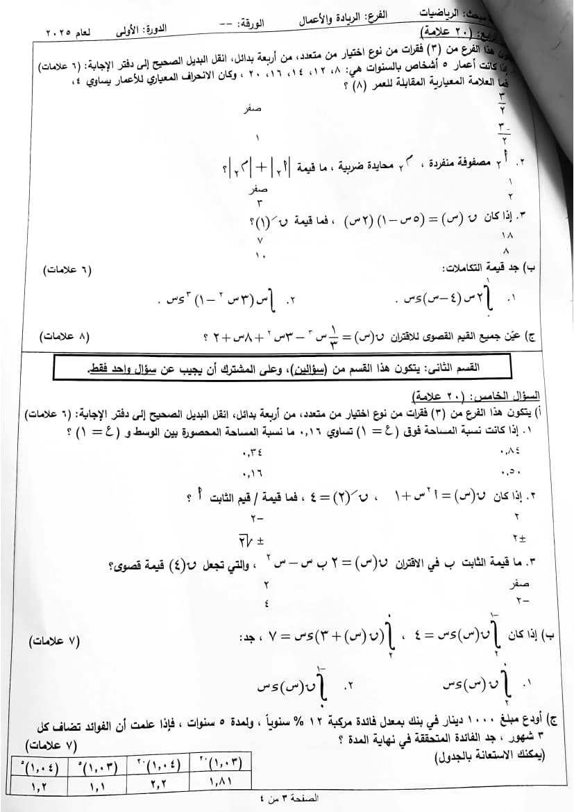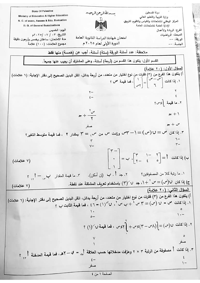 امتحان رياضيات الثانوية العامة (توجيهي ريادي) الدورة الأولى 2025