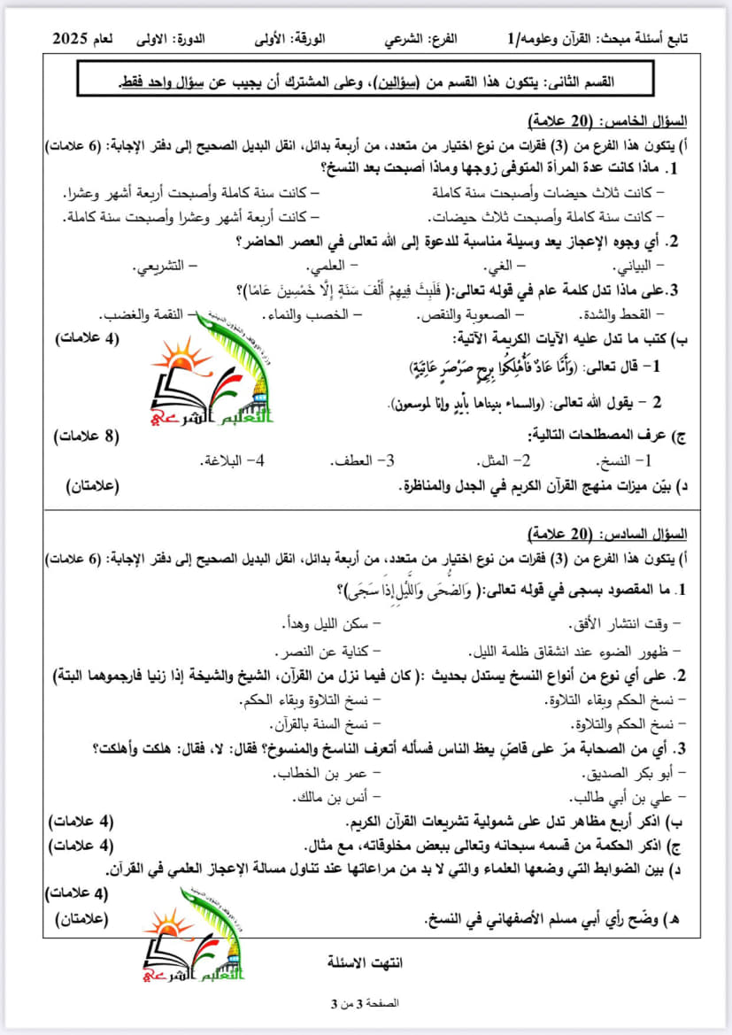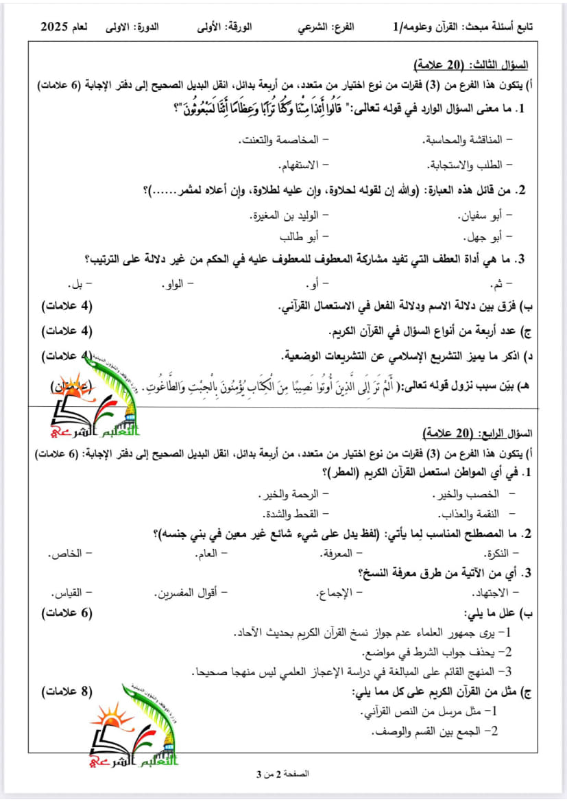 امتحانات امتحان القرآن وعلومه الورقة الأولى الثانوية العامة (توجيهي شرعي) الدورة الأولى 2025