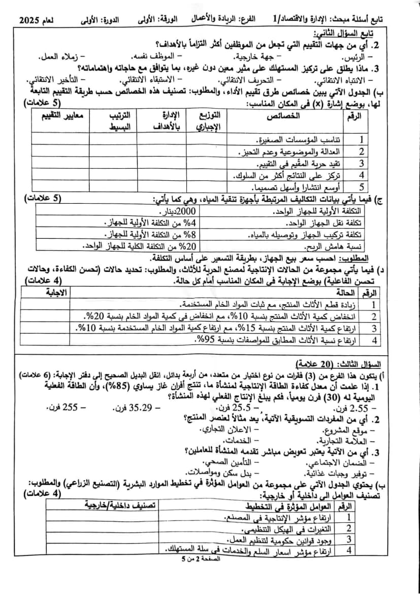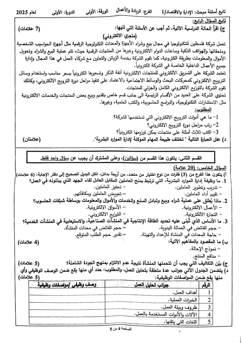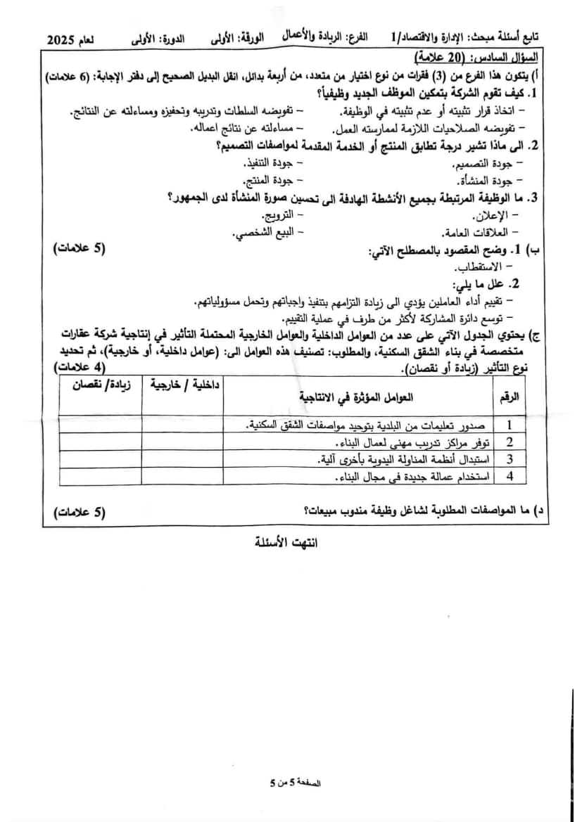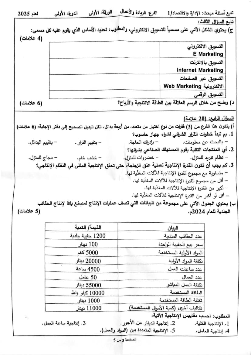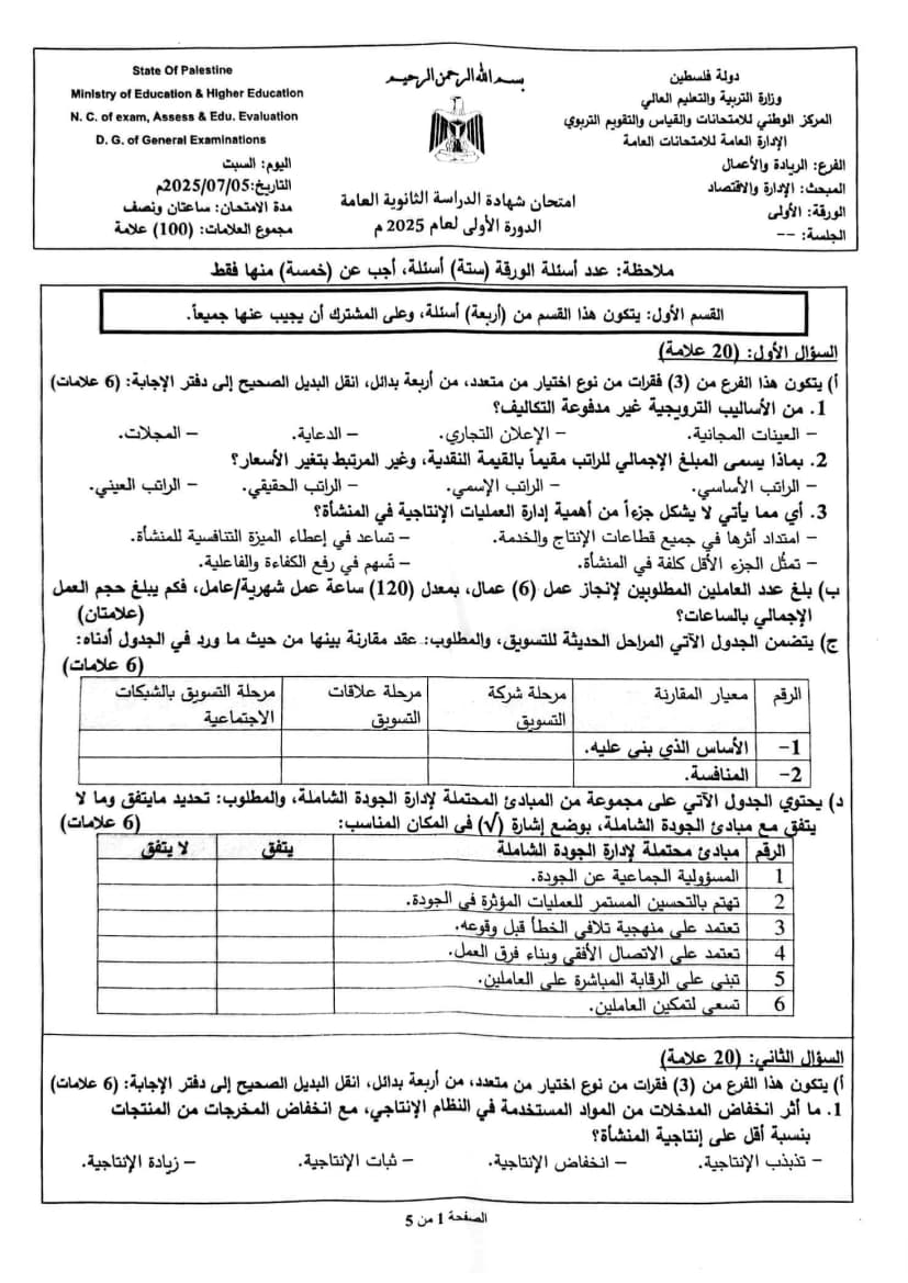 امتحان الإدارة والاقتصاد الورقة الأولى الثانوية العامة (توجيهي ريادة أعمال) الدورة الأولى 2025