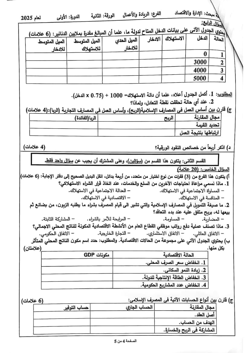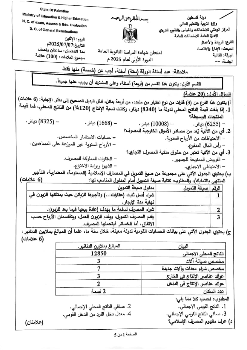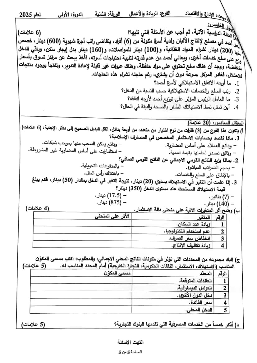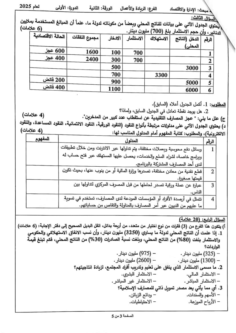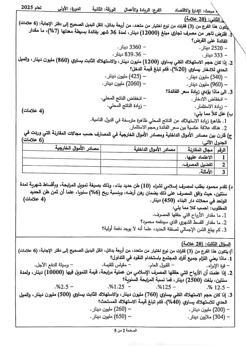 امتحان الإدارة والاقتصاد الورقة الثانية الثانوية العامة (توجيهي ريادة أعمال) الدورة الأولى 2025