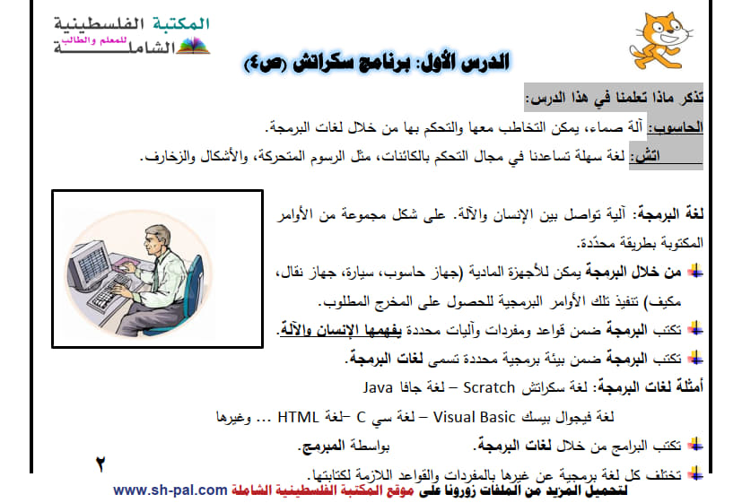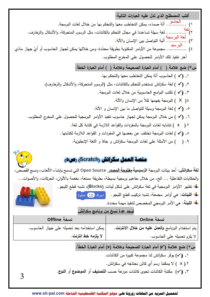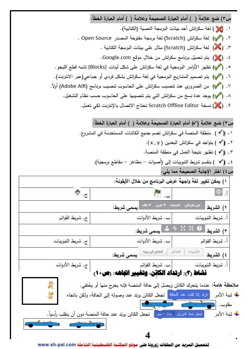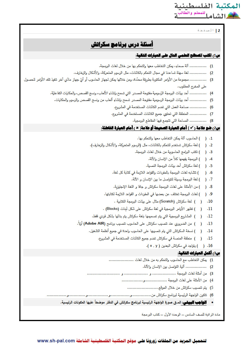 أولاً: ملخص وأسئلة تدريبية في درس برنامج سكراتش سادس ف1