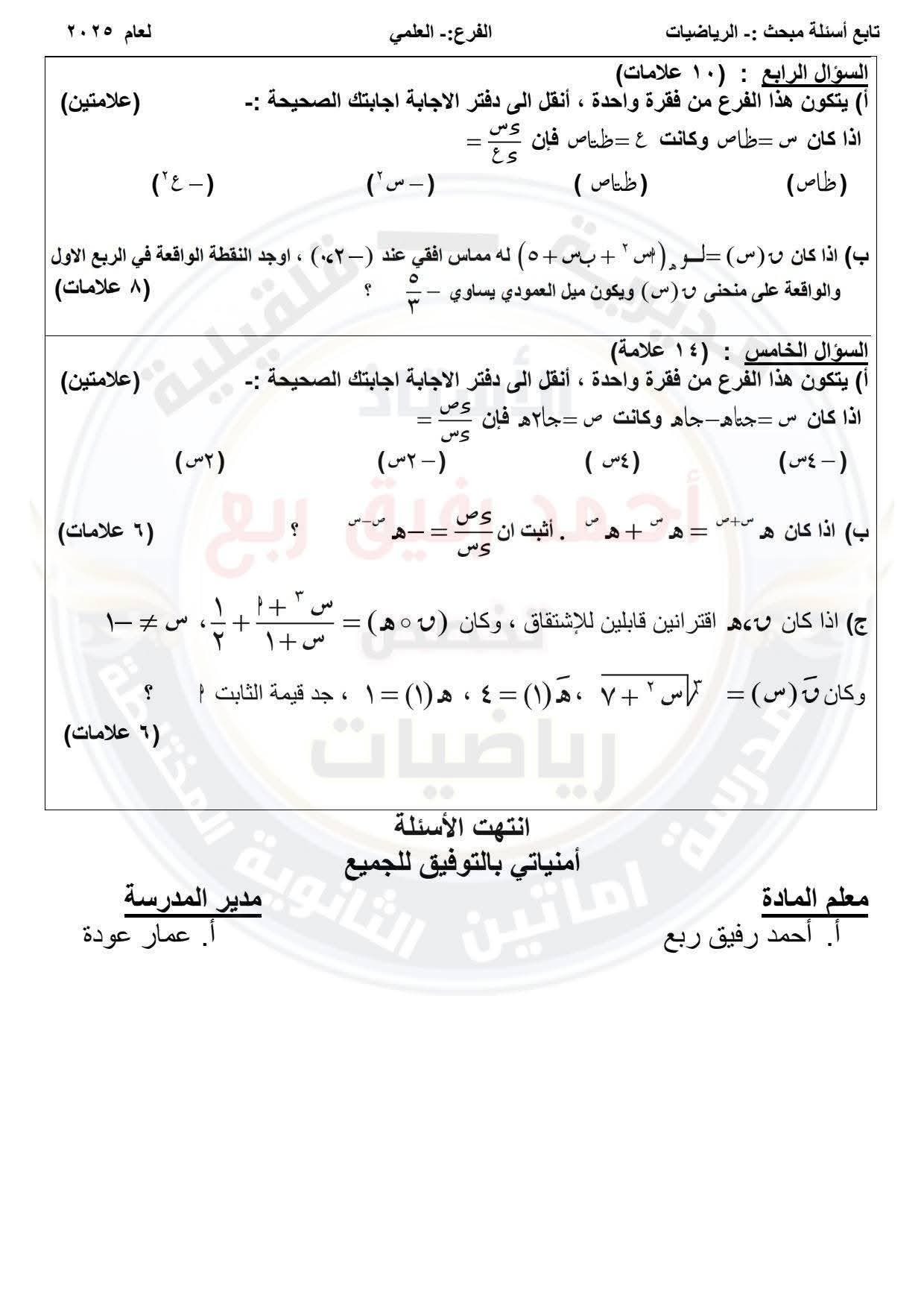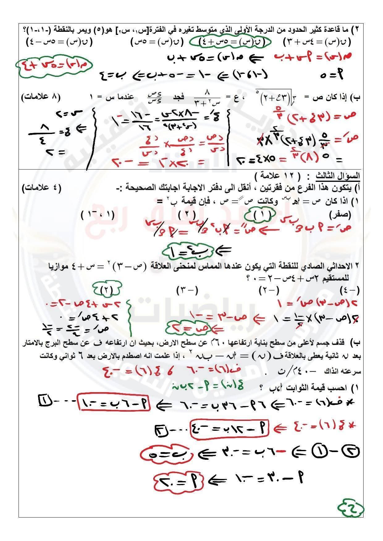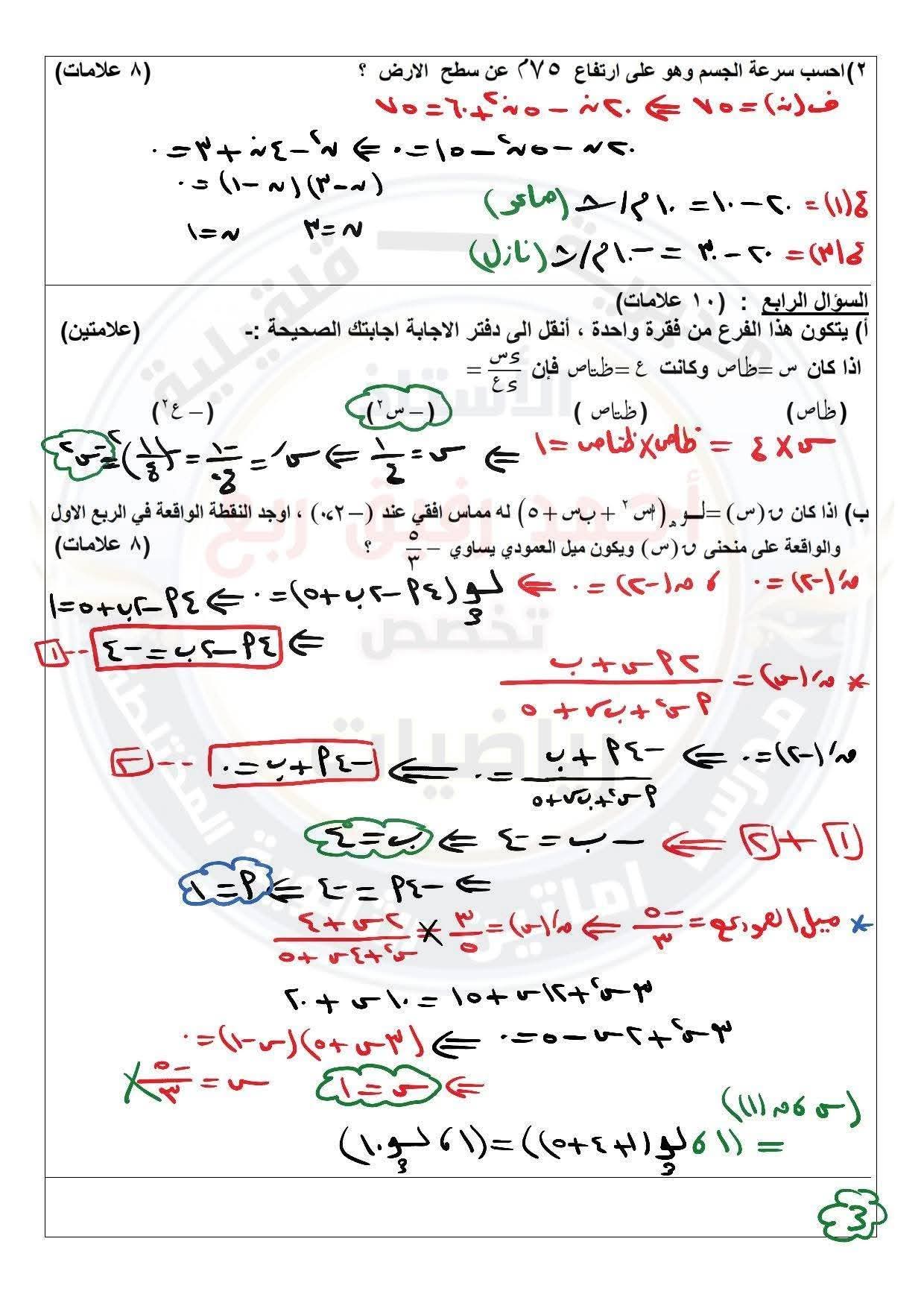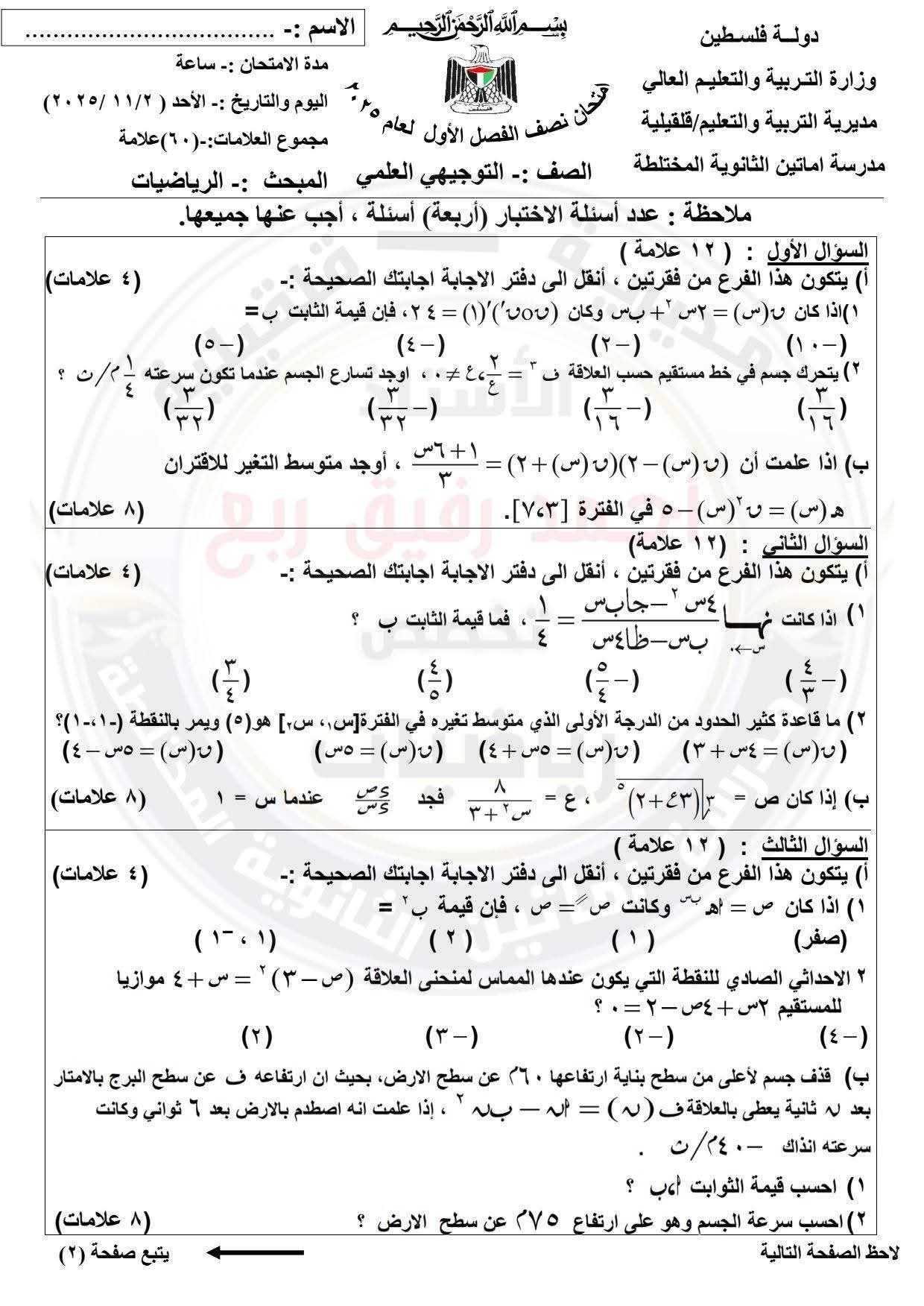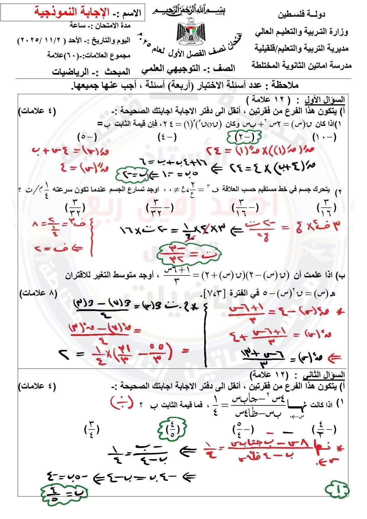 امتحان رياضيات توجيهي علمي نصف الفصل الأول مع الاجابات النموذجية