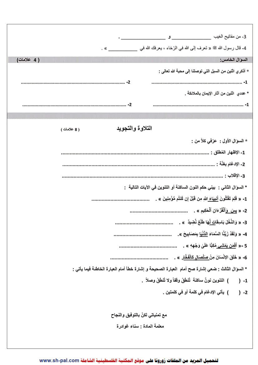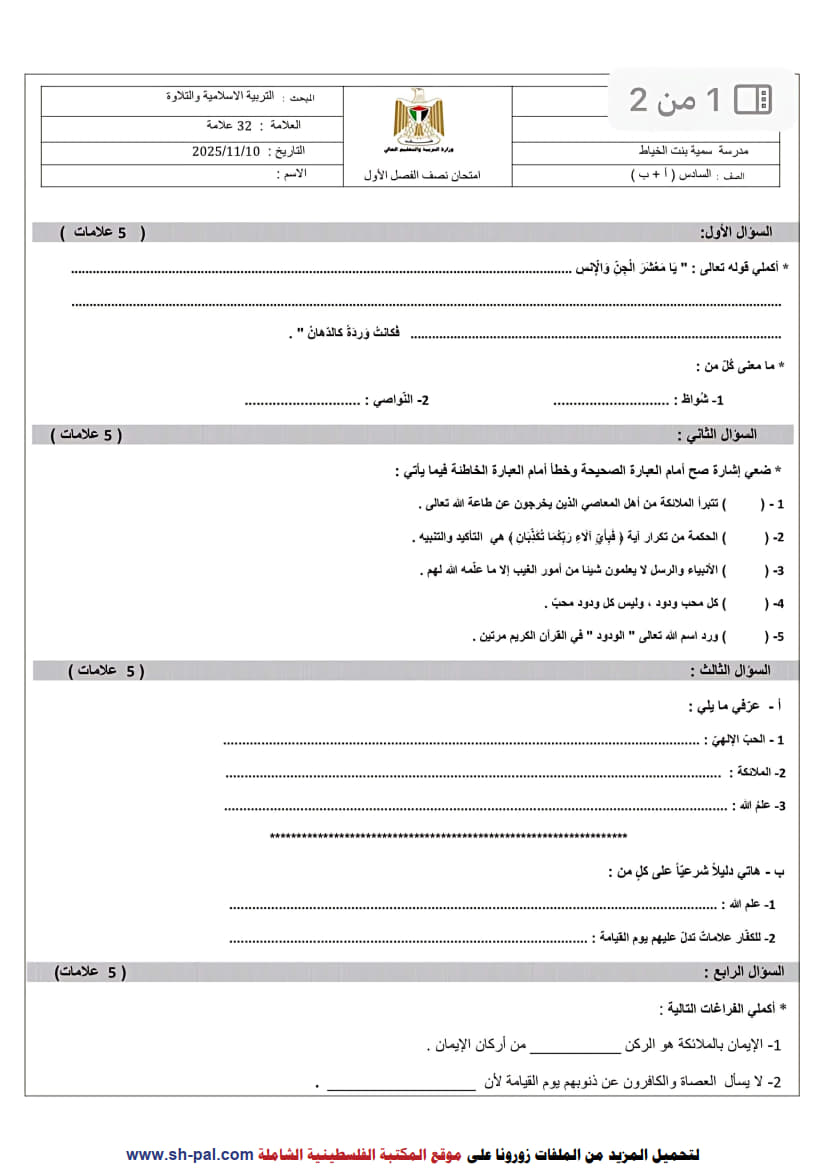 اختبار نصفي في التربية الإسلامية للصف السادس الفصل الاول