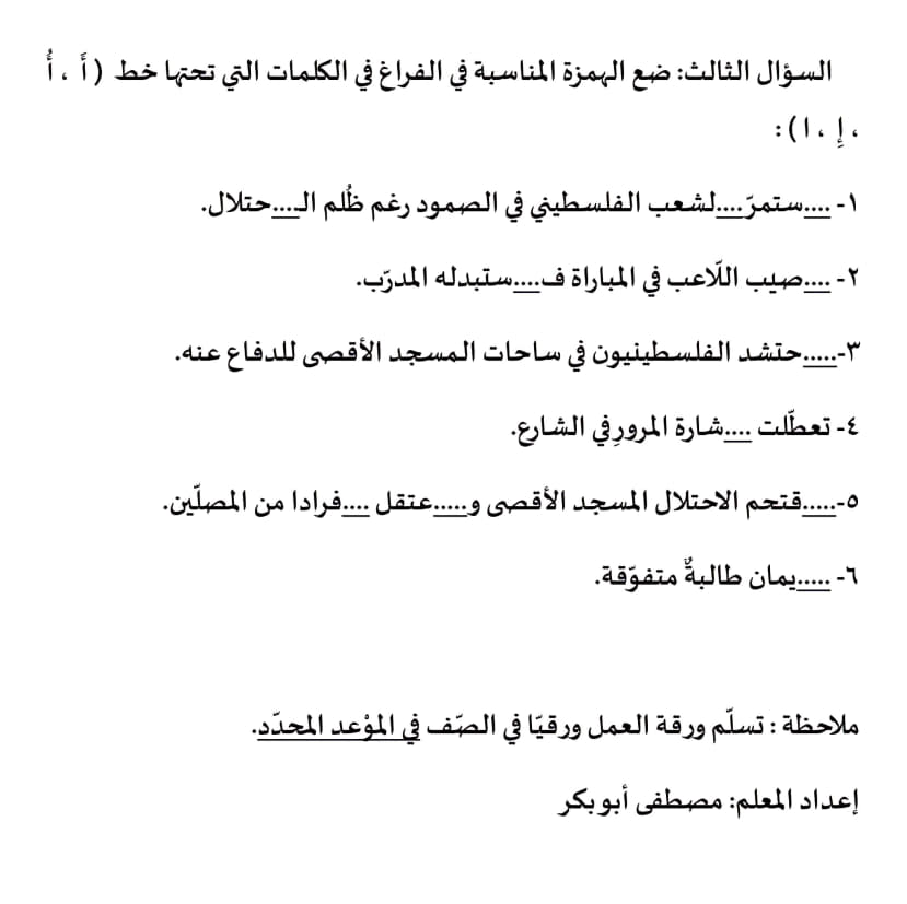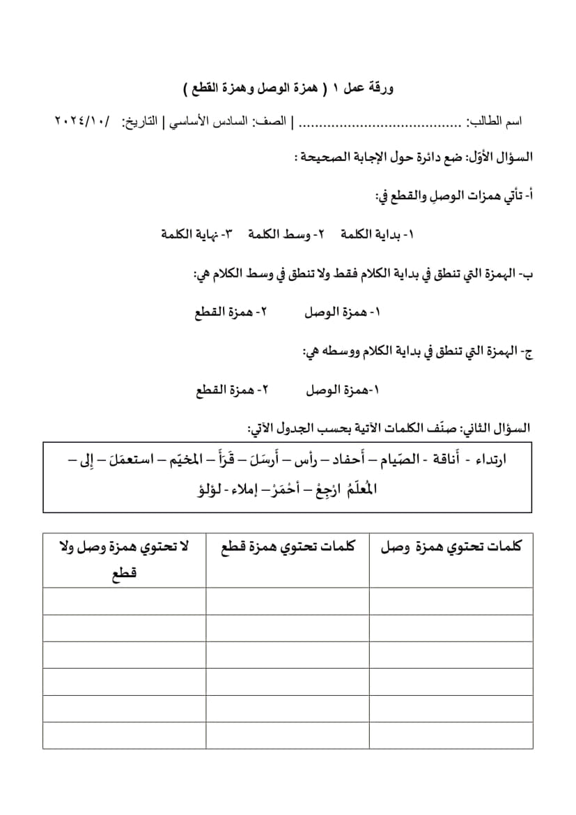 ورقة عمل في درس همزة الوصل وهمزة القطع للصف السادس الفصل الأول