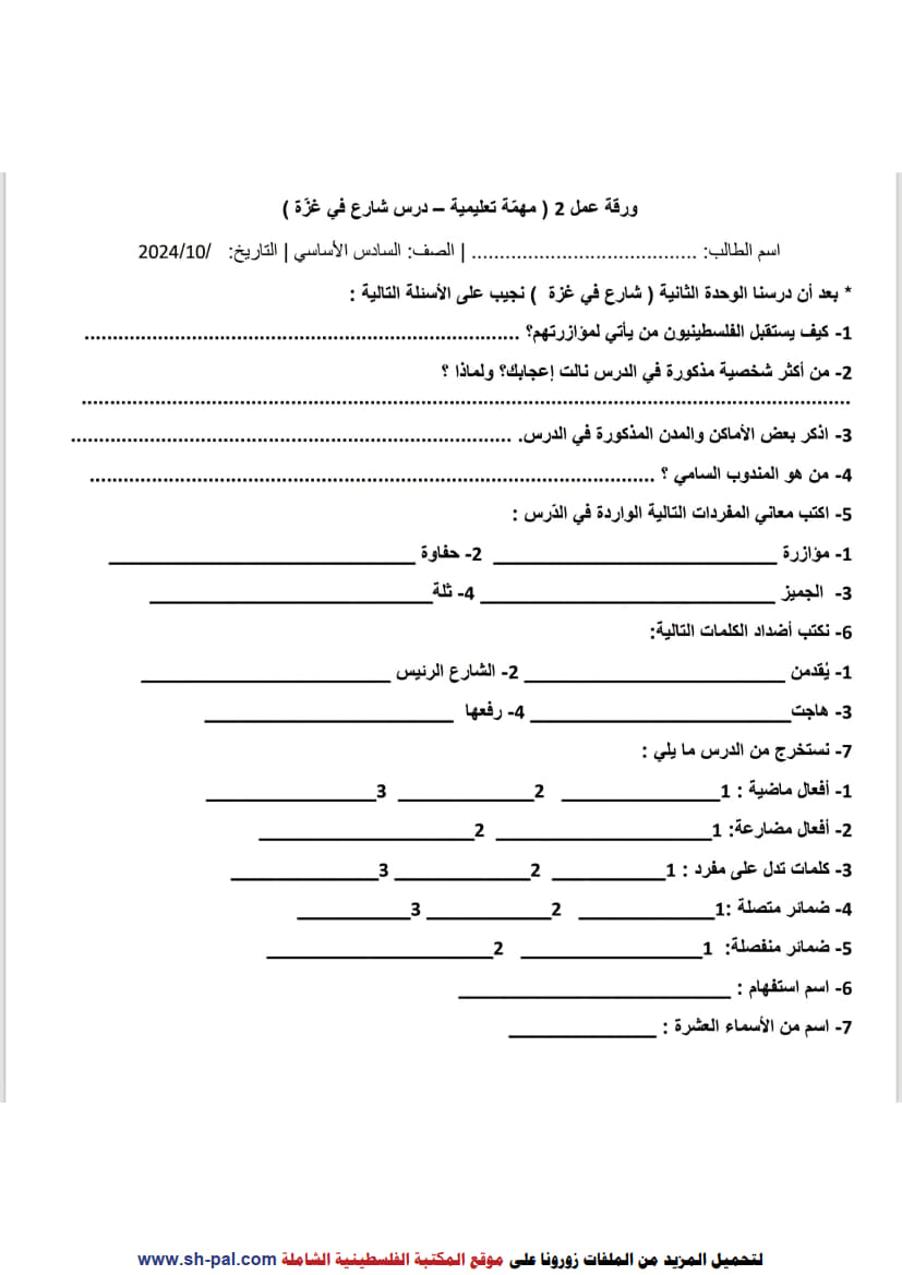 ورقة عمل في درس شارع في غزة للصف السادس الفصل الأول