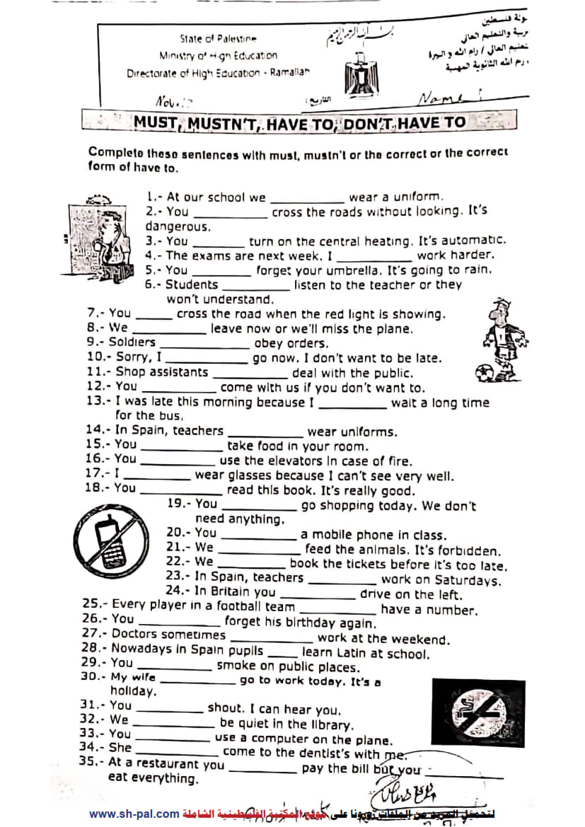ورقة عمل في قاعدة must - mustn't - have to - don't have to حادي عشر فصل أول