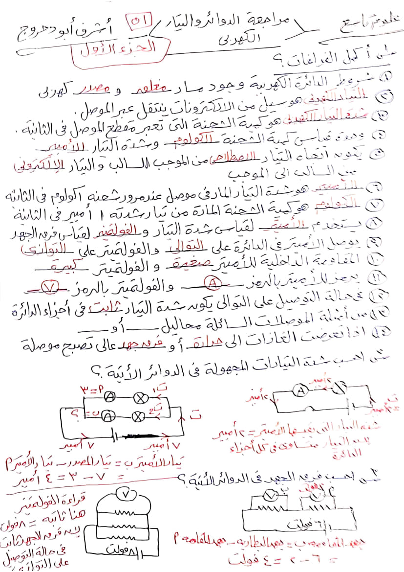 تلخيص درس (التيار الكهربائي والدارات الكهربائية) للصف التاسع الفصل الأول