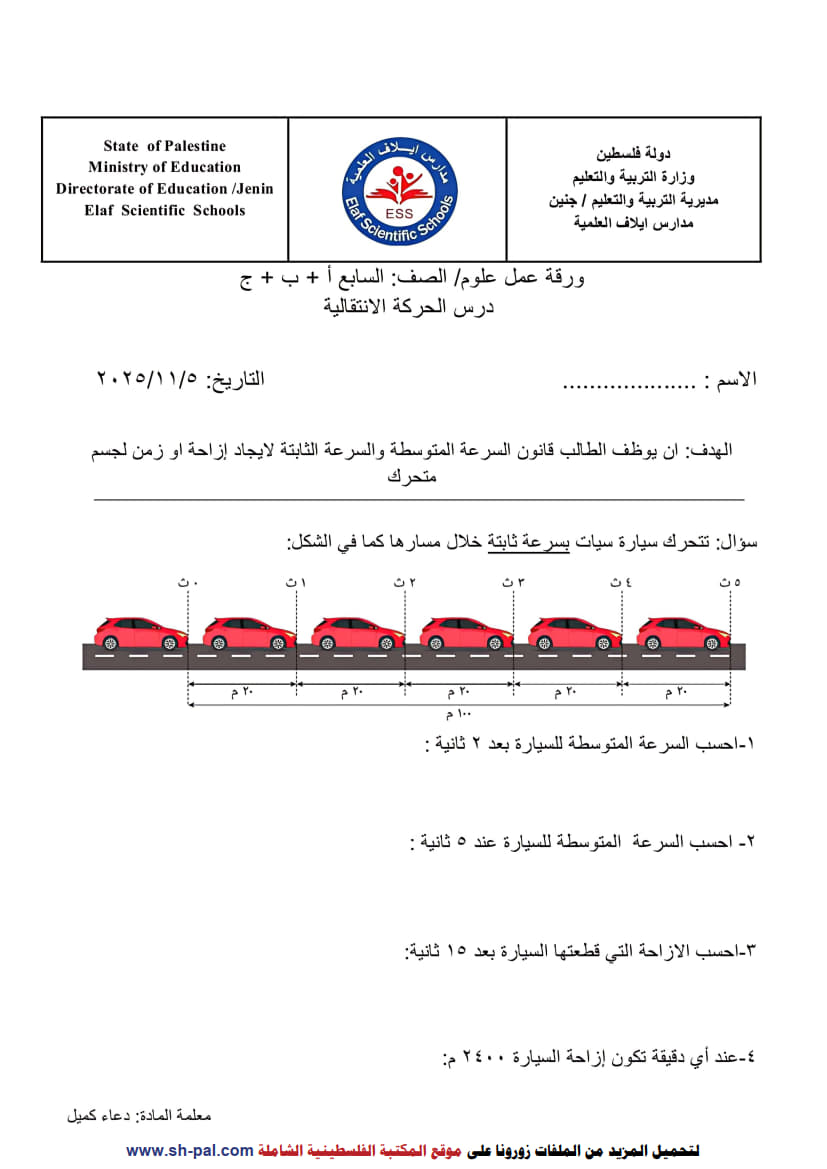 ورقة عمل في درس (الحركة الانتقالية) للصف السابع الفصل الأول