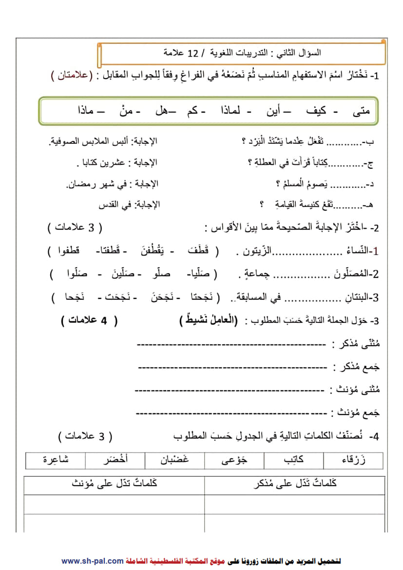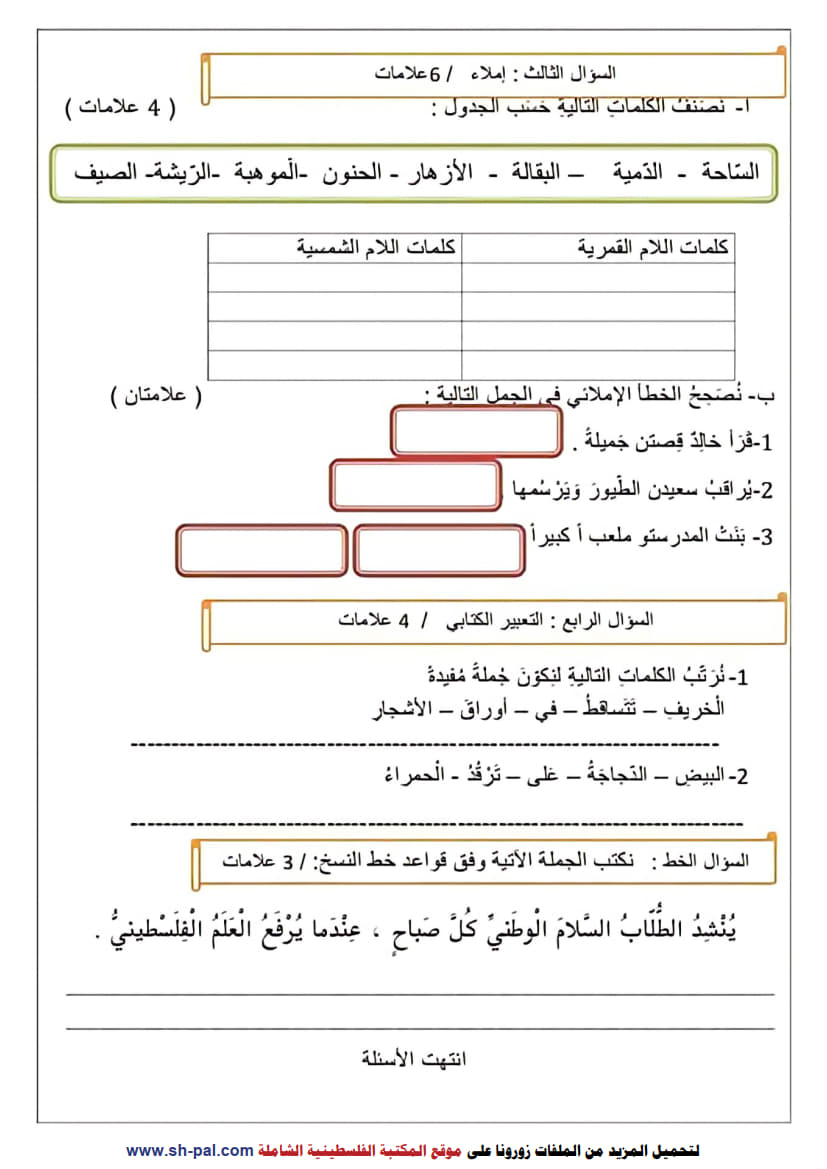 اختبار نصف الفصل الأول في اللغة العربية للصف الرابع