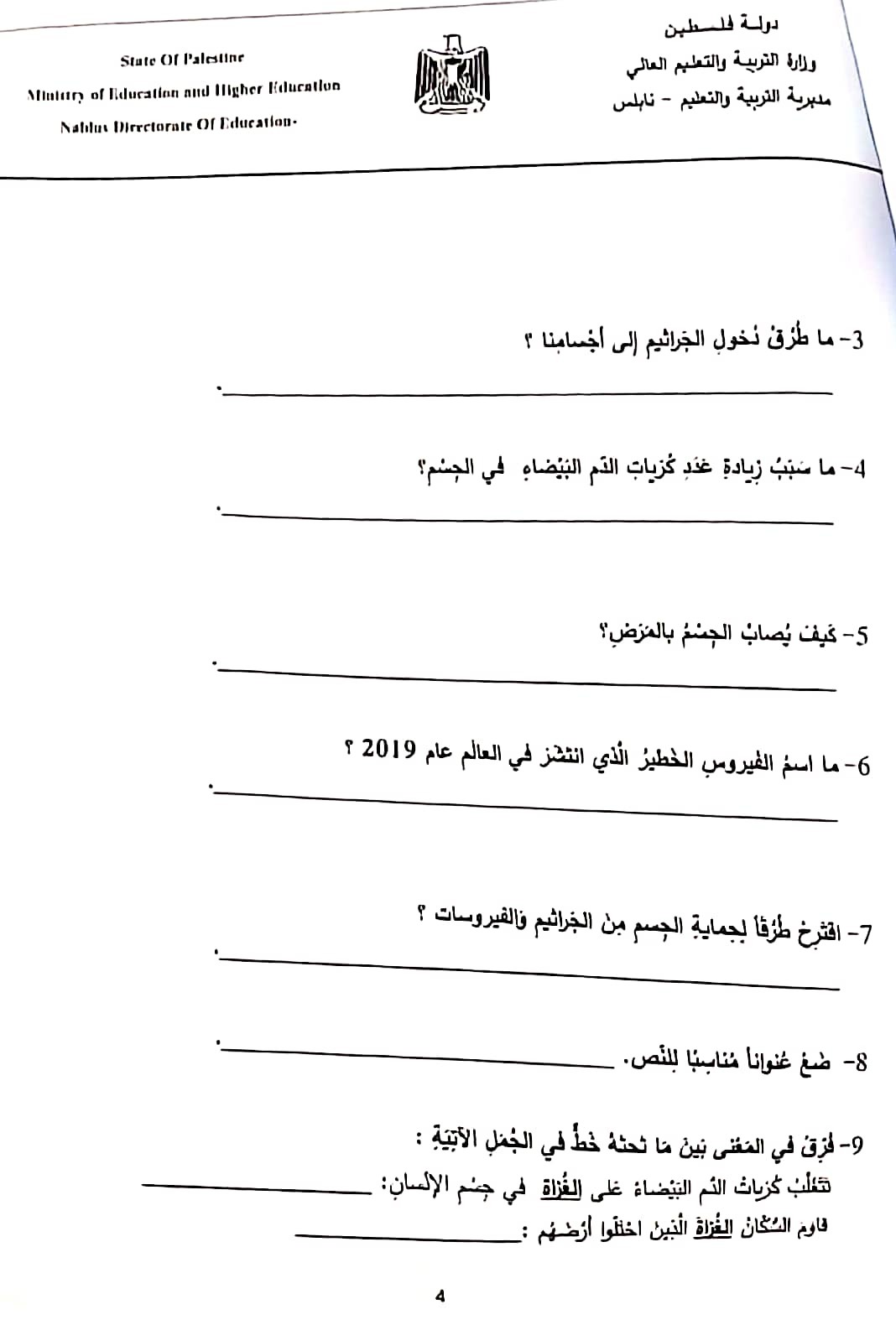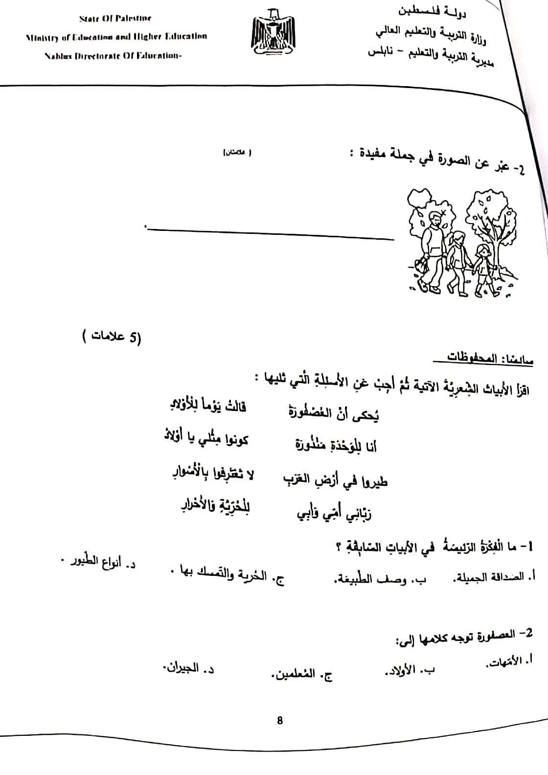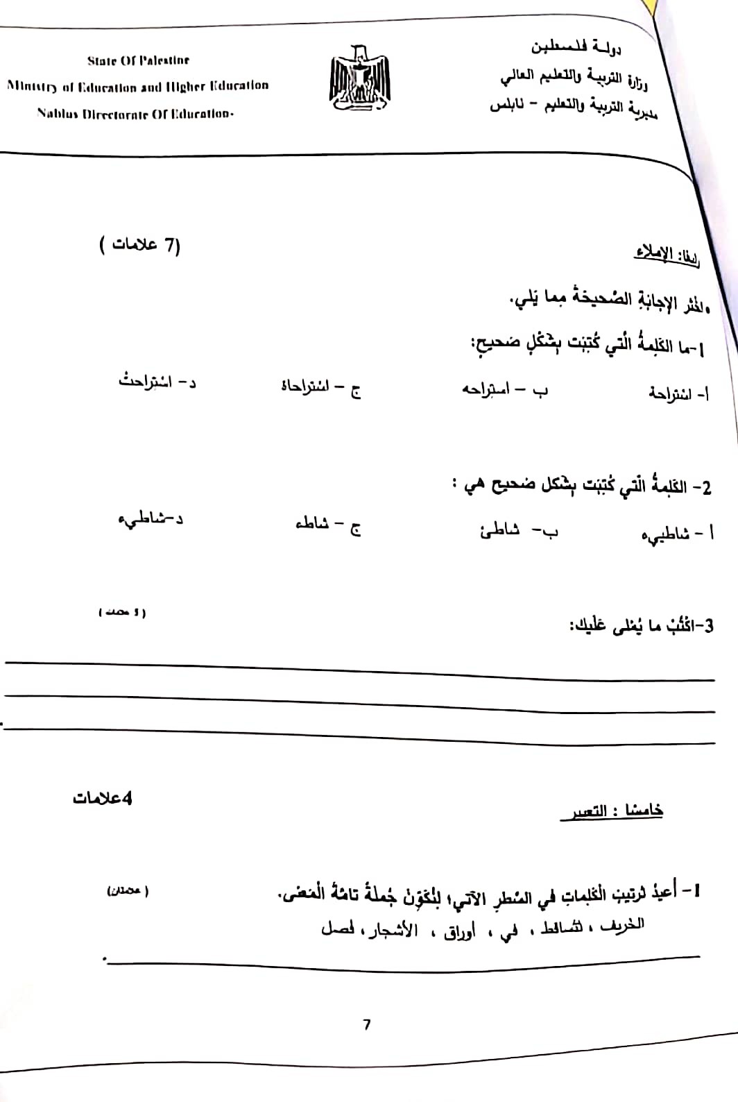 اختبار الشهرين في اللغة العربية للصف الرابع الفصل الأول